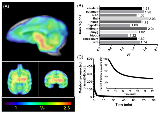 Kinetic modeling results with [11C]CW24 in the macaque brain. (A) The total volume of distribution (VT) images derived from Logan plot with arterial blood data as input function (color bar indicates VT values from 1–2.5 mL/cm3 (blue to red); (B) Regional VT values showed that the expression difference in brain regions; (C) Arterial plasma analysis showed that [11C]CW24 radioactivity was rapidly cleared from blood and [11C]CW24 stability evaluated in plasma over time showed lasting presence of ~47% of parent compound at 30 min.