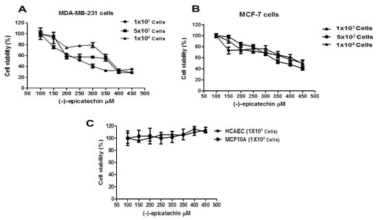 Effects of (−)-epicatechin on cell viability in breast cancer cells. (A) MDA-MB-231, (B) MCF-7 (1 × 103, 5 × 103 or 1 × 104 cells), and (C) human coronary artery endothelial cells (HCAEC) and MCF10A (1 × 104 cells) were grown onto 96-well plates and allowed to grow for 24 h. Then, the cells were treated with (−)-epicatechin (100–450 μM) for 72 h. The number of viable cells was determined by [3-(4,5-Dimethyl-2-thiazolyl)-2,5-diphenyl-2H-tetrazolium bromide] (MTT) assay. Each data point was performed in sextuplicate in three different experiments, and the results were reported as the mean absorption ± SD.