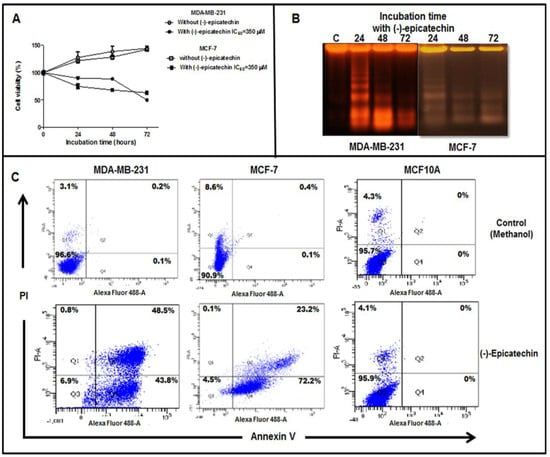 To establish quantitatively the apoptotic effect, MDA-MB-231 and MCF-7 cells were treated with IC50 of (−)-epicatechin, which was stained with Annexin V/PI (propidium iodide) and then analyzed by flow cytometry. After treatment, the cells were divided in quadrant 1 to 4 (Q1 to Q4). The cells in Q1 are necrotic cells, which are PI (+). Cells in the Q2 are late apoptotic cells, which are PI (+) and Annexin V (+). Normal cells are in Q3, which are PI (−) or Annexin V (−). In Q4, cells are Annexin V (+) and early apoptotic cells. Figure 3C shows the flow cytometric analysis of apoptosis in MDA-MB-231 and MCF-7, and the results showed that (−)-epicatechin had an apoptotic effect on both cell lines (Figure 3C). The flow cytometry with Annexin V and PI labeling showed that early (43.8%) and late apoptosis (48.5%) were in a similar mode of cell death in MDA-MB-231 cells. Meanwhile, early apoptosis (72.2%) was the predominant mode of cell death in MCF-7 cells (Figure 3C). Interestingly, the treatment of MCF10A cells with (−)-epicatechin did not induce any mode of cell death by apoptosis, corroborating that the apoptotic effect of (−)-epicatechin is selective to cancerous cells.