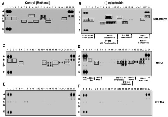 The changes generated by (−)-epicatechin in the expression pattern of human apoptosis-related proteins were investigated using the Human Apoptosis Array Kit (R&D Systems, OR, USA) in accordance with the manufacturer’s instructions. Approximately 1 × 107 breast cancer cells untreated and treated with (−)-epicatechin were solubilized in lysis buffer and centrifuged at 14,000× g for 5 min. The protein concentrations of the resulting lysates were measured by Lowry’s method [40]. The antibody-coated array membranes were blocked in Array Buffer 1 with a 1-h incubation on a rocking platform shaker. Then, the membranes were incubated with 300 µg of protein from each sample at 4 °C with gentle shaking overnight. The following day, the membranes were washed three times with 1X washing buffer on a rocking platform and then incubated with 1.5 mL reconstituted biotinylated antibodies for 1 h on a rocking platform. Thereafter, the biotin-conjugated antibodies were removed and again washed three times with 1X washing buffer. A 1:2000 dilution of the streptavidin-HRP in 1X Array Buffer was used to incubate each of the membranes for 30 min. Following incubation, the arrays were washed three times with 1X wash buffer. The membrane intensity and pixel densities were acquired using c-Didigit (LICOR, Lincoln, NE, USA). The relative differences in the expression levels of each protein in untreated and treated cells were determined by comparing signal intensities among the array images after subtraction of the background signals.