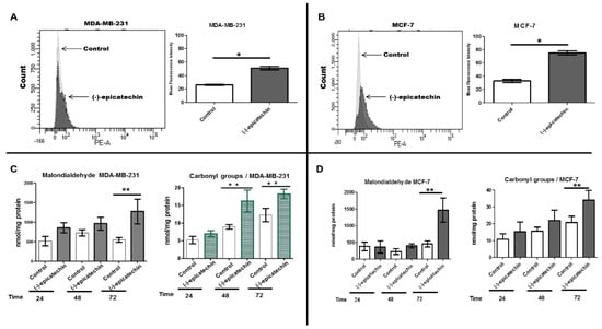 As a result of the intracellular accumulation of ROS can induce apoptosis, the effect of (−)-epicatechin on ROS generation was examined by flow cytometer. We evaluated the production of ROS using the fluorescent MitoSOX™ probe. Interestingly, the exposure of MDA-MB-231 and MCF-7 cells to (−)-epicatechin (350 µM) for 72 h induced an intracellular MitoSOX™ fluorescence (Figure 5A,B, respectively). The generation of ROS was observed in both cells, with a higher generation in the MCF-7 cells (Figure 5B). These data show that the induction of apoptosis by (−)-epicatechin in MDA-MB-231 and MCF-7 cells involved an increase in the production of ROS. Due to the high production of ROS generating oxidative damage to biomolecules, the evaluation of this damage was performed in the presence of (−)-epicatechin. Biomarkers of oxidative damage were assessed at 24, 48, and 72 h of incubation with (−)-epicatechin. As shown in Figure 4C, in MDA-MB-231 cells, (−)-epicatechin generated an increase in lipoperoxidation products (malondialdehyde (MDA)), with 72 h as the time with the highest oxidative damage to lipids (Figure 5C). In contrast, oxidative damage to proteins (carbonyl groups) was also observed beginning at 48 h and still observed at 72 h (Figure 5C). When this oxidative damage was analyzed in MCF-7 cells, (−)-epicatechin generated similar damage to lipid and proteins, but this was observed at 72 h of incubation (Figure 5D). These data strongly suggest that the flavonoid had an impact in the mitochondrial compartment, which generated increased ROS production, oxidative damage, and consequently the induction of apoptosis in cancerous cells.
