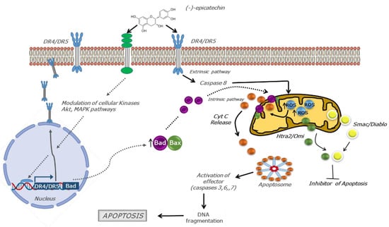 Schematic representation of (−)-epicatechin anticancer activity in MDA-MB-231 and MCF-7 cells. The anticancer effect in MDA-MB-231 cells was possibly triggered through TRAIL receptor interaction (DR4/DR5) and its upregulation. This extrinsic pathway activation was enhanced through the intrinsic pathway, resulting in caspases-dependent apoptosis and enhanced by the modulating of inhibitors of apoptosis by Smac/Diablo and HtrA2/Omi (continuous arrow). In MCF-7 cells, an anticancer effect was evident through the interaction with another receptor, the modulation of cellular kinases, and the upregulation of pro-apoptotic proteins such as Bad and Bax. This Bad and Bax upregulation induced the leak of cytochrome C, Smac/Diablo, and HtrA2/Omi into the cytoplasm, activating apoptosis through the intrinsic pathway. These mechanisms are tightly related to ROS generation (dashes arrow). (Arrows indicate activation, ⊥ indicates inhibition).