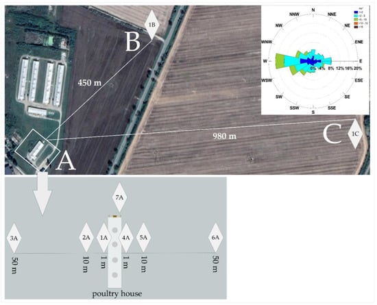Soil samples were collected on the farm area (samples 1–7A). Six sampling locations, three on each of the two sides of the poultry house, were selected by measuring 1, 10, and 50 m from the longer wall. One sample was collected near the litter storage place. Aside from the samples in the area of direct impact of the poultry house, reference samples were taken (Figure 1). The reference sample 1B was taken at a distance of 450 m in a straight line to the North East. The references sample 1C was taken at a distance of about 1000 m in a straight line to the East. Samples were taken twice (in March, samples suffix M, and in July samples suffix J) to check for potential seasonal variation, in both cases, about 5 weeks after the poultry house was settled.