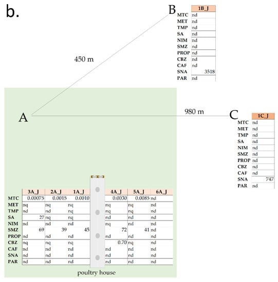 MTC is administered as an antiemetic and intestinal peristalsis drug, and must be given via subcutaneous or intramuscular injections every 12 h. MTC is given to inhibit, among others, the process of defecation—which is also intended to maintain greater hygiene in the poultry house during breeding []. The highest MTC concentrations were observed at 7A_M where used litter is temporarily stored. Taking all of this into consideration, it can be concluded that poultry litter is a serious source of pharmaceuticals.