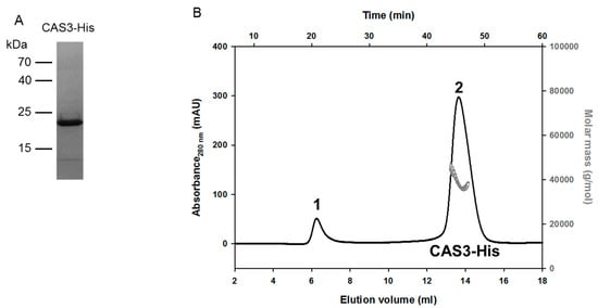 The protein encoded by the cas3 gene belongs to the cab-like sub-class of β-CAs and is localized to the cytoplasm []. Indeed, the cab-like CAs take their name from the enzyme discovered in the archaeon Methanobacterium thermoautotrophicum, which has only one such enzyme, called cab [], and they are amongst the smallest CAs ever reported. Similar to cab, CAS3 that is reported here is composed of 174 amino-acid residues, with a calculated molecular mass of 19.2 kDa. CAS3 was synthesized in E. coli Rosetta (DE3) cells as a C-terminal His-tag fusion protein (Figure 1). After purification, 5–7.5 mg CAS3 could be obtained per L of culture. The purified enzyme was dialyzed against 50 mM 4-(2-hydroxyethyl)-1-piperazineethanesulfonic acid (HEPES) pH 8.3, 50 mM NaCl. To analyze the state of CAS3-His in solution, size‑exclusion chromatography and multi-angle laser light scattering (SEC-MALLS) was performed (Figure 1). The calculated molar mass of CAS3 amounts to 38,650 g∙mol−1 (±0.1%), which corresponds to 1.9 times of the CAS3 monomer (20.36 kDa) (Figure 1). These findings suggest that the biological unit of CAS3 is a homo-dimer in solution, which is the same as for cab and other β-CAs from fungi or bacteria that have been investigated to date [,,,,].