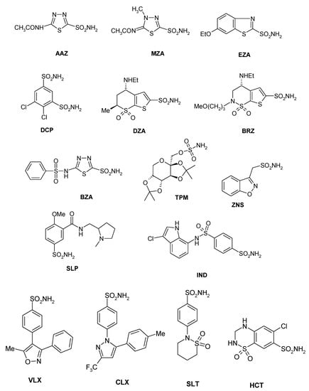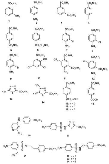 We, thus, conducted a detailed inhibition study of CAS3 with a panel of sulfonamides and one sulfamate, of types 1–24 and AAZ–HCT (Figure 2). The latter compounds are in fact clinically used drugs as diuretics, antiglaucoma, antiepileptic, and antiobesity agents. They target some of the many human isoforms involved in these pathologies [,,,,,,].