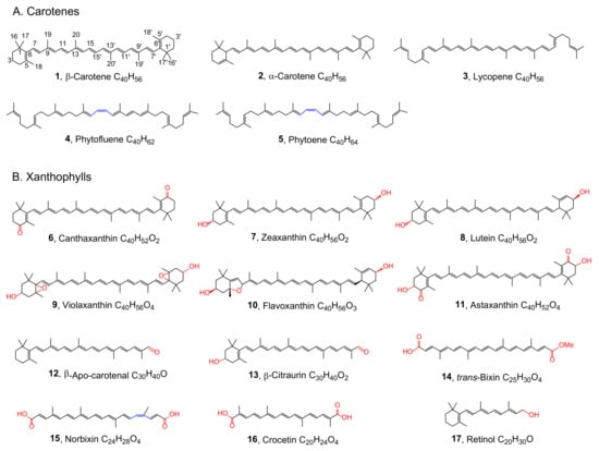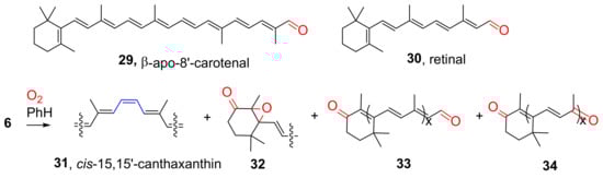 That β-carotene serves as a source of vitamin A in animal nutrition has been known for a long time [3]. β-Carotene’s aptitude as a pro-vitamin A compound was tested by several experiments in which vitamin A-deficient rats were treated with it. These experiments resulted in the detection of retinol (17) in the intestinal walls of the animals [4,5,6]. It was during these experiments that the enzyme β-carotene-15,15′-dioxygenase was detected [7]. This enzyme cleaved β-carotene at its central bond with the production of retinal (30), which could then be reduced to retinol. However, in vitro experiments failed to detect retinal in some systems prepared from rat intestines and were, therefore, unable to demonstrate quantitatively the conversion of β-carotene to retinol in vivo. Other reports have appeared that suggest protection, during lycopene and β-carotene consumption, against the menace of cardiovascular diseases including atherosclerosis, myocardial infarction, and stroke [8,9,10].