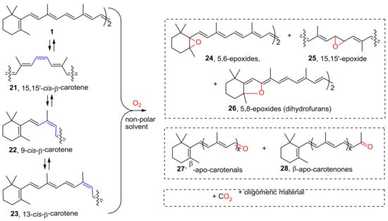 El-Tinay and Chichester found that the oxidation of β-carotene with molecular oxygen in toluene afforded β-carotene-5,6-monoepoxide (24) and the corresponding 5,8-monoepoxide (26) together with diepoxides [49]. For β-carotene oxidation by molecular oxygen in non-polar solvents we found the initial products included the 5,6-epoxides, 5,8-epoxides (24, 26), the 15,15′-epoxide (25), a series of β-apo-carotenals (27), and β-apo-carotenones (28) together with carbon dioxide and oligomeric material (Scheme 1). At long oxidation times the epoxides became less important, small amounts of alcohols and probably acids were also formed, and the shorter chain carbonyl components tended to predominate [51,52]. In addition, product spectra gave evidence that isomerization of trans-1 took place with the production of cis isomers of β-carotene. Krinsky et al. demonstrated the formation of a homologous series of carbonyl products, including β-apo-13-carotene, retinal, β-apo-14′-carotenal, β-apo-12′-carotenal, and β-apo-10′-carotenal during the autoxidation of β-carotene [32]. Kennedy and Liebler identified 5,6-epoxy- (24) and 15,15′-epoxy-β-carotenes (25) from the treatment of β-carotene with peroxyl radicals [53]. Rodriguez and Rodriguez-Amaya studied the oxidation with mCPBA (meta-chloroperbenzoic acid) and observed similar epoxides and diepoxides, whereas oxidation with KMNO4 afforded mainly the carotenals and carotenones [54].