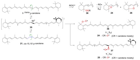 The coupling of diradical 35 with oxygen could take place at either end with production of peroxyl diradical 36. Alternatively, oxygen could be picked up at sites along the chain, for example at C-15 or C-15′ to afford peroxyl diradicals such as 37. The peroxyl radical 36 may add to another β-carotene molecule and the resulting peroxide would then undergo intramolecular homolytic substitution (SHi) with production of the 5,6-epoxy-β-carotene 24 plus a carotene alkoxyl radical CR-O•. In the same way intermediate 37 would yield 15,15′-epoxy-β-carotene 25 (see Scheme 3). There are numerous precedents for this kind of homolytic substitution [65,66,67,68]. A second, probably more important, route to epoxides accompanies this initiation process. The addition of a peroxyl radical to C-5 of the carotenoid, at the end of the conjugated chain, will produce an extensively stabilized intermediate radical 38. The latter can then undergo SHi at C-6 or at C-8 with the production of 5,6-epoxide 24 and/or 5,8-epoxide 26 (Scheme 3). The attachment of ROO• to terminal C-5 affords the most thermodynamically stabilized intermediate (38) and this probably accounts for the preponderance of 5,6- and 5,8-epoxides.