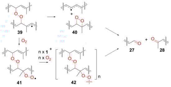 The carotenoid peroxides 39 (analogous to 38) could undergo an alternative SHi process that yields dioxetanes 40. The resonance stabilization of the carotenyl radical that is produced at the same time would lower the free energy of this process. The unstable dioxetanes 40 would then dissociate rapidly to produce β-apo-carbonyls (27 and 28). Alternatively, a series of additions of lengthening carotenyl-peroxyl radicals could give rise to oligomeric peroxides 42. The carbonyls could arise from the thermal decomposition of this oligomer as it “unzipped.” The oligomeric peroxyl radicals 41 are formed from the coupling of oxygen with the delocalized carotenoid radicals 39. Could this process take place randomly at all the sites of unpaired electron density in the radical or would coupling be directed to a specific site or sites? Some light was shed on this question during an EPR (Electron Paramagnetic Resonance) spectroscopic study of spin trapping of the delocalized retinyl and β-ionyl radicals [69]. The spectra showed that nitroxide spin adducts were formed at all the secondary and tertiary C atoms of the carotenoid radical’s conjugated systems. There was a small preponderance of coupling at secondary rather than tertiary sites. Oxygen is smaller than the nitroso spin trap and more reactive, so it is probable that the coupling of radicals like 39 with oxygen takes place randomly at all possible sites.