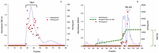 Chromatographic separation of the TBL-IE2 fraction. (A) Molecular size exclusion chromatography (Sephadex G-75). Red dots indicate fractions with agglutination activity (units per mg of protein), and the blue line shows the absorbance of the protein at 280 nm. TBLF is shown at the top. (B) Ion-exchange chromatography. Red dots indicate the fractions’ agglutination units per mg of protein, the absorbance at 220 nm of the protein fractions is shown in blue, and the green line marks the gradient from 0 to 1 M NaCl. The second peak, named TBLF-IE2, is indicated at the top.