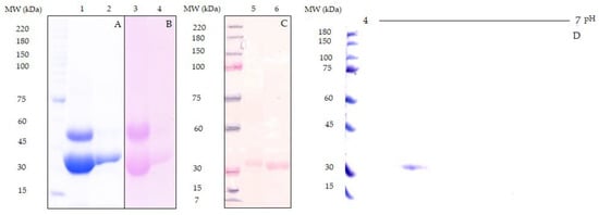 The purified lectins were separated by SDS-PAGE, using 10% resolving gels according to Laemmli []. Coomassie blue R-250 was used for protein staining. Glycoproteins present in the polyacrylamide gels were stained following the PASS technique [,]. In addition, the proteins were transferred to a nitrocellulose membrane. A primary anti-rabbit antibody for Tepary bean lectins previously designed in our laboratory was used. Subsequently, a secondary antibody (AffiniPure Anti-Rabbit IgG Santa Cruz, CA, USA) was employed for specific protein identification. The immunoreactive proteins were visualized using the AmershamTM ECLTM Western Blotting Analysis SystemM kit. Two-dimensional electrophoresis was carried out according to Görg et al. [] using a 7 cm immobilized pH gradient (IPG) strip with a linear pH gradient from pH 4 to 7. The second-dimension separation was carried out using a 10% polyacrylamide gel. Silver staining was performed according to the protocol reported by Blum et al. [].