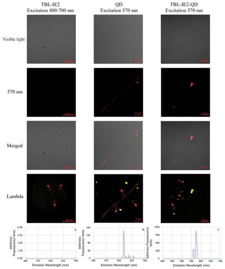 Fluorescence images for the TBL-IE2-QD complex. Analysis in visible light, excitation analysis at 570 nm, visible light and excitation at 570 nm merged, and lambda analysis from 400 to 700 nm (taking a reading every 2 nm). (A) TBL-IE2, lambda figure size 94.01 µm × 94.01 µm where no fluorescence was observed; (B) Quantum dots, lambda figure size 34.46 µm × 34.46 µm, with a single peak at 570 nm; (C) Analysis of the TBL-IE2-QD complex, lambda figure size 134.95 µm × 134.95 µm—a peak can be observed at 574 nm, and a second peak at 560 nm with less intensity.