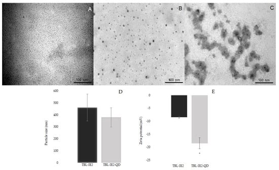 The hydrodynamic diameter (Z-average) and zeta potential of the TBL-IE2 and TBL-IE2-QD complex were determined with a Zetasizer ZS90 (Malvern®, Malvern, UK). Briefly, 20 μg/mL samples were placed in polystyrene disposable cells. Each sample was analysed on a Zetasizer Nano ZS90 DLS, at a 90° angle in triplicate, each measurement consisting of 10 runs of 60 s. For the zeta potential and particle size, the samples were placed in folded-capillary disposable cells and evaluated in triplicates of 15 runs. Results were reported as mean ± standard deviations.