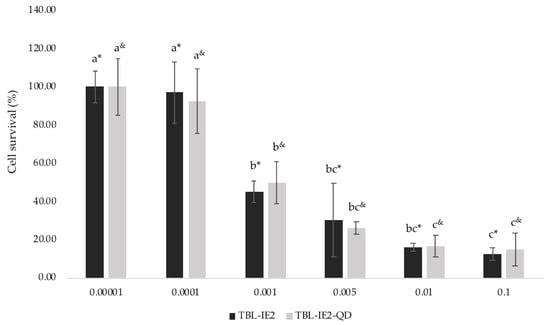 Cytotoxic effect of TBL-IE2 and TBL-IE2-QD complex on HT-29 cells. The cell survival percentage rate after different treatments of TBL-IE2 and TBL-IE2-QD is shown. Small letters (*) TBL-IE2 and (&) TBL-IE2-QD indicate statistically significant differences between concentrations for each treatment (Tukey, p < 0.05).
