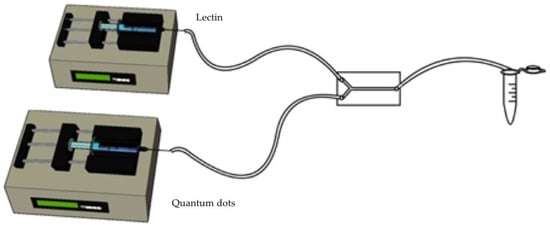 QD stock solution was prepared by dissolving 10 mg of CdTe-QD powder in 1 mL of deionized water (pH 6). The QD were then diluted in 1× PBS (pH 6) at a concentration of 9.5 × 10−3 mg/mL. The lectin (20 μg/mL) was placed in a 10 mL syringe (Terumo®, NJ, USA), supplied at a flow rate of 1.8 mL/h, while QD were placed in a 10 mL a glass syringe (Hamilton®, Reno, NV, USA) to avoid interaction with the syringe surface, and supplied with a flow rate of 2.4 mL/h. The product was collected in low-protein-binding polypropylene microtubes (Figure 6) and dialyzed through a 3.5 kDa membrane to eliminate the uncoupled QD, after which the corresponding characterization tests were performed. In order to compare the efficiency of microfluidics, the same lectin and QD dilutions at the same pH were used for coupling by covalent bonding (a non-microfluidic method), using glutaraldehyde as a coupling agent, which were kept in continuous agitation for 15 min and then dialyzed.