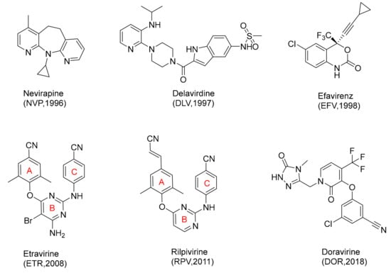 - Zhuang, C.; Pannecouque, C.; De Clercq, E.; Chen, F. Development of non-nucleoside reverse transcriptase inhibitors (NNRTIs): Our past twenty years. Acta Pharm. Sin. B 2019. [Google Scholar] [CrossRef]
