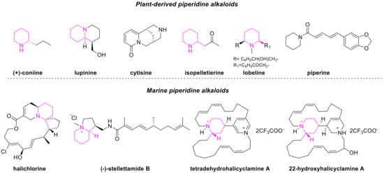 Piperidine alkaloids are widespread natural products in the plant kingdom, but they are also present in the animal one, in particular in marine microorganisms [