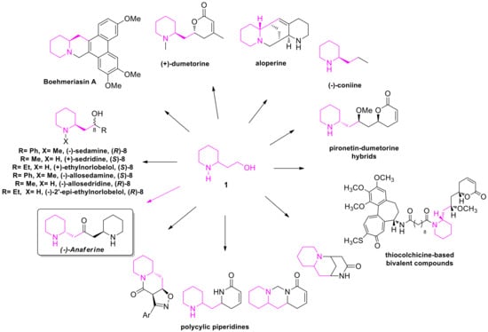 In this context, we realized that some of the cited natural products shared a common structural motif, constituted by a piperidine ring substituted in the 2-position, generating in this way a defined stereocenter (shown in pink in