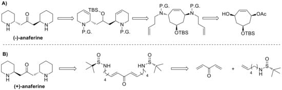(–)-Anaferine is a bis-piperidine alkaloid, in which the two rings are connected through their C-2 atoms by a 2-propanone bridge. Being C2-symmetrical, this framework exists as two enantiomers and a meso-form. The diastereomeric mixture was isolated for the first time in 1962 [
