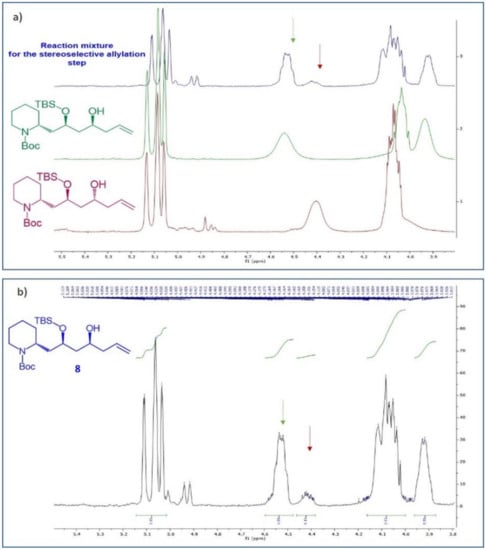 3.4. Synthesis of (R)-tert-butyl 2-((2R,4S)-2-((tert-butyldimethylsilyl)oxy)-4-hydroxyhept-6-en-1-yl) piperidine-1-carboxylate (8)
