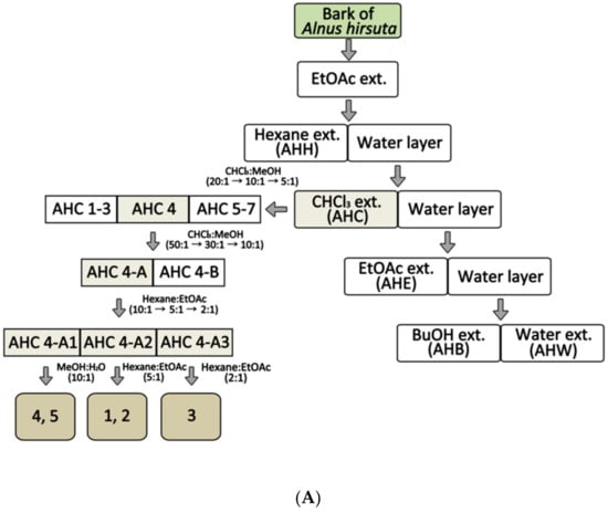 Dried stem bark of A. hirsuta obtained from Jecheon district in Korea was identified by Prof. Hyoung-Tak Im of Chonnam National University (CNU). A voucher specimen (JNU-A017) was deposited at the Herbarium of College of Pharmacy, CNU in Korea. The stem bark of A. hirsuta (5.0 kg) was pulverized and then extracted with 5 L ethyl acetate (EtOAc) at room temperature three times for 24 h. The extracted solution was concentrated in vacuo to 608× g residue of the crude EtOAc extract. The extract was suspended in H2O and partitioned sequentially with 2 L of each solvent of hexane, CHCl3, EtOAc, n-BuOH and H2O, resulting in a residue of AHH (65 g), AHC (81 g), AHE (260 g), AHB (127 g), and AHW (75 g), respectively. The AHC extract (40 g) was further separated into seven fractions (AHC 1–7) by eluent CHCl3-MeOH. Open column chromatography (silica-gel, Kieselgel 60, 1.07734.9025, Merck, Darmstadt, Germany) and Medium Pressure Liquid Chromatography (MPLC, YFLC 530, YAMAZEN, Osaka, Japan) with an ODS-SM-50B column were used for the separation and isolation. Isolated compounds were purified by Sephadex LH-20 (Pharmacia, Piscataway, NJ, USA). Individual compounds were isolated from subfraction AHC 4 of the AHC extract.