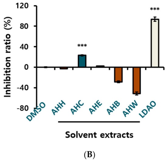 Extraction and isolation from Alnus hirsuta by activity guided fractionation: Anti-yeast assay on Saccharomyces cerevisiae was employed as a guide for the separation. (A) Separation procedure; EtOAc extract (EtOAc ext.) (B) Growth inhibition ratio of yeast treated with solvent extracts. The yeast culture solutions were treated with the extracts at a concentration of 1.5 mg/mL. The inhibition ratio was calculated by following equation: Inhibition ratio (%) = 100−[(T−T0/N− N0) × 100]; T: the OD of yeast solution after incubation; T0: the OD of yeast solution before incubation; N: the OD of negative control after incubation; N0: the OD of negative control before incubation; 0.1% DMSO in culture medium: negative control; lauryldimethylamine oxide (LDAO) of 688.2 µg/mL: positive control; optical density (OD). Data of *** p < 0.005 vs. control.