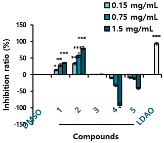 Growth inhibition ratio of yeast treated with the compounds 1–5 isolated from the AHC extract. The inhibition ratio was calculated by following equation: Inhibition ratio (%) = 100 − [(T − T0/N − N0) × 100]; T: the OD of yeast solution after incubation; T0: the OD of yeast solution before incubation; N: the OD of negative control after incubation; N0: the OD of negative control before incubation; 0.1% DMSO in culture medium: negative control; LDAO of 688.2 µg/mL: positive control; optical density (OD). Data of * p < 0.5, ** p < 0.05, and *** p < 0.005 vs. control.