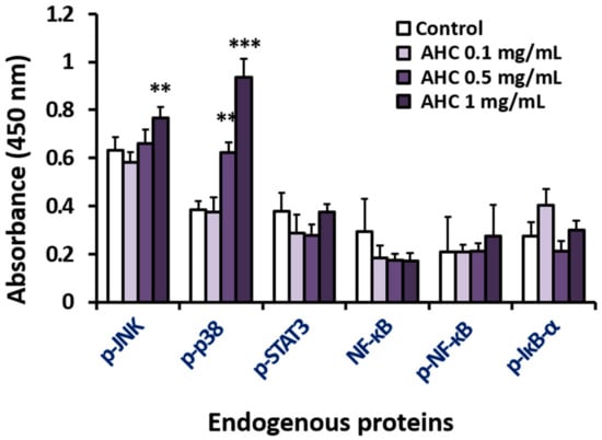 Effects of the AHC extract on the stress activated MAPKs and inflammatory markers in MCF-7 cells. Levels of endogenous proteins after 24 h treatment were detected by enzyme-linked immunosorbent assay (ELISA). phospho-p38 (p-p38), phospho-JNK (p-JNK). Control: 0.1% DMSO in culture medium. Data of **p < 0.05 and ***p < 0.005 vs. control.