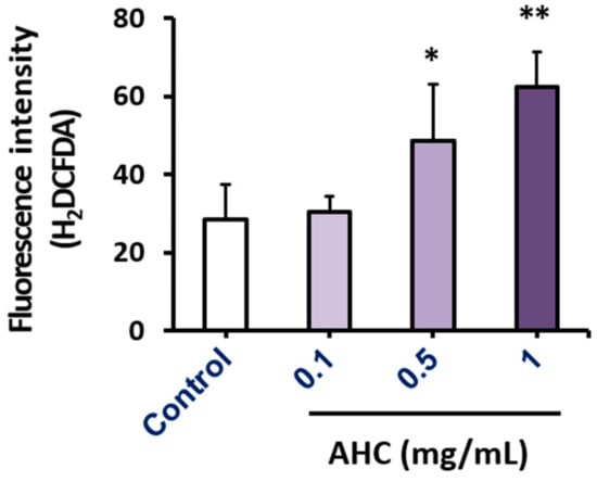 Effects of the AHC extract on ROS generation in MCF-7 cells. Level of ROS generation by AHC after 24 h treatment was monitored by flow cytometry. Control: 0.1% DMSO in culture medium. Data of * p < 0.5 and ** p < 0.05 vs. control.