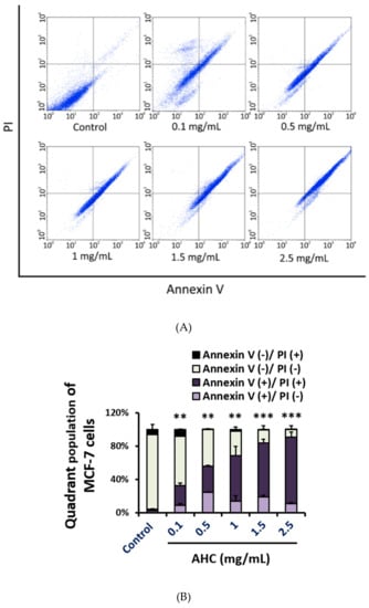 To establish the in vitro anticancer effect of the AHC extract, we assessed the apoptotic effect against MCF-7 cells by flow cytometry analysis using Annexin V and PI double-staining dyes. The assay was based on the capacity of Annexin V to bind to the exposed phosphatidylserine (PS) of the apoptotic cells with high affinity. Propidium iodide (PI) binding to DNA of the cells was employed to distinguish the late apoptotic and necrotic cells. The quadrant populations of the cells represent the viable [Annexin V(−)/PI(−)], early apoptotic [Annexin V(+)/PI(−)], late apoptotic [Annexin V(+)/PI(+)], and necrotic [Annexin V(−)/PI(+)] cells, respectively. The number of viable cells of AHC 2.5 mg/mL treated group was significantly reduced (9.2 ± 4.7%) compared to that of control group (89.3 ± 6%). The percentages of early apoptotic cells and late apoptotic cells of the AHC 2.5 mg/mL group were 10.8 ± 1.6% and 80.0 ± 6.3%, which were significantly higher than the control groups with 2.5 ± 0.5% and 2.0 ± 0.2%, respectively (Figure 7).