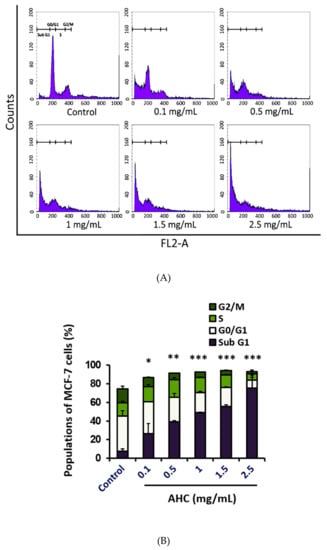 Cell cycle arrest effect of the AHC extract against MCF-7 cells. (A) Histograms of cell cycle distribution (B) Diagram of each cell phase distribution. Histogram of DNA contents after 24 h treatment monitored by flow cytometry was presented. Control: 0.1% DMSO in culture medium. Data of * p < 0.5, ** p < 0.05, and *** p < 0.005 vs. Sub G1 phase of control.