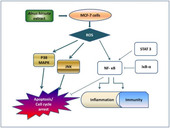 The AHC extract and two diarylheptanoids significantly reduced the survival rate of MCF-7 cells. Taken together, the effects might be exerted by the AHC extract affecting the factors of the above signal transduction pathways. Based on these data, we summarized the potential regulatory route of the AHC extract in MCF-7 cells as depicted in Figure 9. Current study presents that activation of the p38 and JNK can lead apoptotic effect in MCF-7 cells. The pathway is consistent with the route suggested by previous researches [21,53,75,76,77,78,79,80,81].