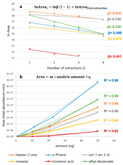 Solid phase microextraction (SPME) is an analytical technique that allows a solvent-free extraction of analytes of interest developed in 1990 by Pawliszyn and Arthur [13]. SPME works by a partitioning process between the solid and the gaseous phase in the extraction chamber and then a partitioning process between the gaseous phase and a sorbent material, represented by a fused silica fibre coated with a thin layer of a selective coating. The fibre can be exposed to the sample matrix, in order to extract organic compounds of interest directly from the sample (direct immersion SPME) or from the sample headspace (HS). The extracted compounds are then desorbed and separated by HPLC or GC, often coupled with mass spectrometry (LC-MS and GC-MS) [14] and the signal intensity provided by SPME and GC-MS is proportional to the free concentration of target compounds, defining the fraction of the analyte that is bioavailable [15]. During last years, HS-SPME has been applied in many food analysis studies to detect the components responsible for the odour and aroma in a number of different food matrices [16,17,18,19]. However, HS-SPME is a non-exhaustive extraction method, since a determinate amount of analyte is removed by the sample matrix until its concentration reaches the equilibrium between the solid and gaseous phases involved in the process. Several approaches have been developed to overcome this issue and to reach a reliable quantification of extracted compounds. One of these is the so-called multiple headspace (MHS) extraction method, a stepped procedure whose theory was introduced by Kolb in 1982 [20]. Briefly, an almost exhaustive extraction of analytes is performed exposing the fibre to the sample HS in several consecutive extractions. After this step, a logarithmic linear regression is performed, plotting the number of performed extraction versus the natural logarithm of the respective total ion current (TIC) area for each compound. The slope of the linear regression line obtained represents the natural logarithm of β, where β is an analyte-dependent constant that indicates the extent of the decay across successive extractions, as follows: