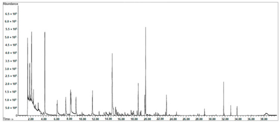 The development of the multiple extraction technique provided a good response when considering the exponential decay of target analytes during the consecutive extractions. With the only exception of ethyl decanoate (β = 0.326), the β factors obtained were included a range considered optimal for a correct estimation of the analytes’ total areas (0.4 < β < 0.95). A β value higher than 0.95, in fact, would indicate that the chromatographic area of the analyte under investigation appears unchanged even after several extractions, meaning that the amount of analyte the fibre can extract is meagre if compared to its total amount. Conversely, a β value lower than 0.4 would mean that the reduction of the chromatographic area among successive extractions is very consistent and that the analyte could be exhaustively extracted even by mean of a single extraction [22,23]. We obtained R2 ≥ 0.98 for all the curves obtained after the external calibration of the instrument by mean of liquid injection, with the exception of nonanoic acid that showed a R2 = 0.87. This phenomenon can been imputed to the low solubility of highly polar carboxylic acids in the non-polar stationary phase of the column (DB-5MS) employed in the chromatographic separation of compounds, resulting in peak fronting and in a low system sensitivity for nonanoic (as well as a higher LOD). In Figure 2, a TIC chromatogram of a representative sample analysed after 240 days of ripening (t4) is presented.