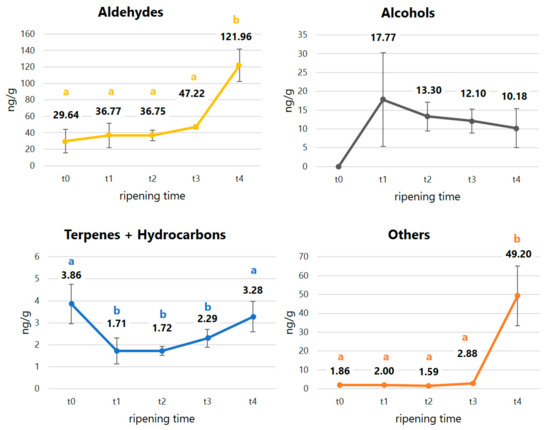 Twenty-five key volatile compounds were detected with a good degree of certainty in eggs and caviar samples, showing a significant variability among different ripening times. The estimative quantitation of compounds by mean of the multiple extractions procedure provided reliable results. For many compounds, we found a great variability among samples collected at the same ripening time, reflecting considerable standard deviations within the same group (t0, t1, t2, t3, and t4). However, it has to be specified that such entity of data variability could be imputed to the fact that caviar analysed in this study was collected by the producer in cans of different dimensions (500 g or 1800 g) and adding slightly different concentrations of NaCl (3.6% or 3.8%), which could have influenced the ripening process and led to the huge variability. To overcome this problem, during the construction of the statistical model, we considered cans dimension and NaCl percentage as within-subject factors, in order to evaluate only the significance of the ripening time.