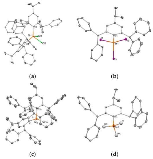 Therefore, synthesis of desired aryltin dichlorides 5 and 6 turned out the be straightforward. Following known procedures [28], the aryl iodides 1 and 2 were individually treated with a slight excess of nBuLi (1.15 eq) in Et2O at low temperatures, followed by subsequent addition of SnCl4 (0.5 eq) at low temperatures. Mixtures of halide species Ar2SnCl2, Ar2SnICl and Ar2SnI2 were expected in crude products [28]. Nevertheless, NMR investigations of the crude product after extraction of an aliquot with CDCl3 revealed the formation of mainly one tin species (see Supplementary Materials; p S2, Figures S1 and S2). In agreement with literature values, the main products were first identified to be Ar*2SnCl2 5 and 6, which was later confirmed by X-ray crystallography (Figure 2). In contrast to Molloy et al. [28], who observed the sole formation of the corresponding distannane BrAr2SnSnAr2Br when using the less sterically hindered carbanion 2,4,6-iPr3C6H2Li with SnBr4 in THF, we were not able to identify significant amounts of distannane in crude products with the highly sterically crowded Ar*Li.