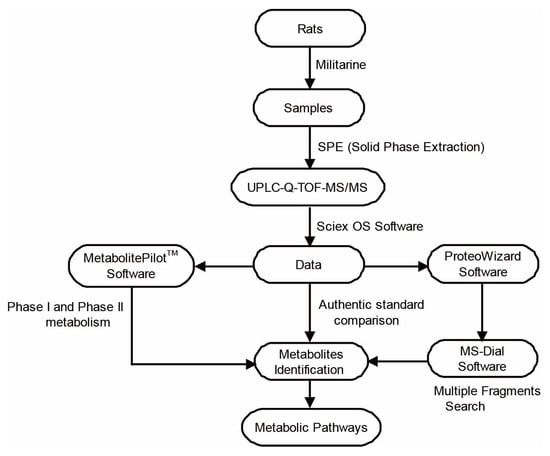 Then, an IDA (information-dependent acquisition) analysis with dynamic background subtraction and mass defect filter (MDF) were performed in negative ion mode with full-scan datasets obtained. For the subsequent data mining processing, MetabolitePilotTM 2.03 software (AB SCIEX, Framinghamcity, MA, USA, 2019) with MDF, product ion filter (PIF) and neutral loss filter (NLF) were utilized to screen possible metabolites of militarine in biosamples based on the accurate mass measurement and common biotransformation reactions. LC-MS/MS data were converted to mzXML format using ProteoWizard 3.0 software [24]. Then, multiple fragments search with MS-Dial 4.0 [25] (http://prime.psc.riken.jp/Metabolomics_Software/MS-DIAL/) was applied to supplement and refine possible metabolites based on characteristic fragment ions from the pattern of militarine, as well as the predicted metabolites by MetabolitePilotTM. The list of predicted fragment ions not only includes ions generated from the parent structure but also was extended by possible biotransformations for more comprehensive and reliable metabolite identification. The common fragments display a similar structure, thus identifying the putative metabolites based on the precursor information. The custom fragment ions and neutral loss molecules were listed in Table S1. As a result, a rapid structural illumination of militarine homologous metabolites was implemented, and the metabolic pathways of militarine were proposed.