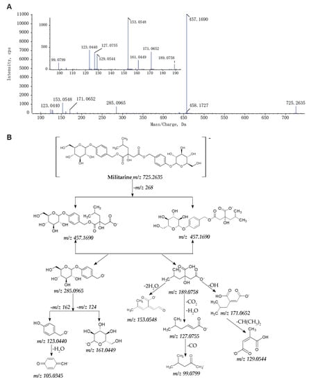 The MS2 spectrum (A) and characterized fragmentation pathway (B) of militarine.