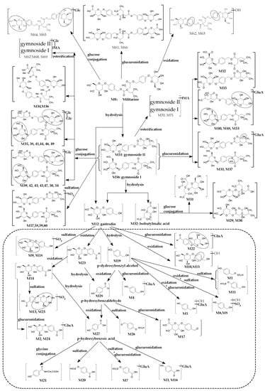 In the present study, a total of 71 metabolites were detected and identified in rats after oral administration of militarine, which indicated that militarine proceed extensive biological metabolism after oral administration. The proposed metabolic profiles of militarine in rats were shown in Figure 5. Both phases I and II reactions were involved in militarine metabolism, whereas hydrolysis was the dominant metabolic pathway. As a common ester, militarine was converted to gymnoside I and II, gastrodin, and isobutyl-malic acid by carboxylesterase [33]. Then, these primary hydrolytic metabolites could proceed further biological metabolism include hydrolyzation, oxidation, and conjugation. Otherwise, the oxidation, glycosylation and glucuronidation products of the intact militarine were also detected. Structurally, the tentatively identified metabolites could be categorized into four major groups: (a) Metabolites with the entire molecule of militarine (M33, M37, M61, M64–M66); (b) metabolites with gymnoside I (II) (M33, M37, M61, M64–M66); (c) metabolites with isobutyl-malic acid (M29, M30, M31); (d) metabolites with gastrodin (M1-M28).