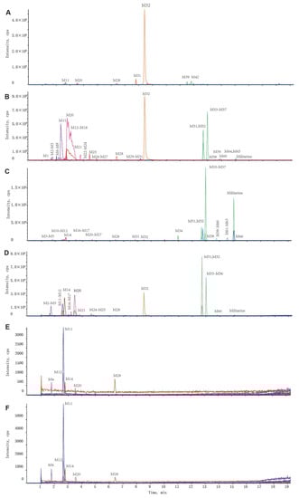 Representative extracted ion chromatograms (XICs) of the metabolites of militarine in biological samples of rats. (A) Feces; (B) urine; (C) bile; (D) plasma; (E) CSF; (F) CSF (gastrodin administration).