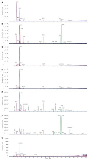 Representative extracted ion chromatograms (XICs) of the metabolites of militarine in tissue samples. (A) Heart; (B) liver; (C) spleen; (D) lung; (E) kidney; (F) duodenum; (G) brain.