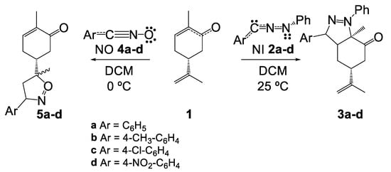 Ríos-Gutiérrez, M.; Domingo, L.R.; Esseffar, M.; Oubella, A.; Ait Itto, M.Y. Unveiling the Different Chemical Reactivity of Diphenyl Nitrilimine and Phenyl Nitrile Oxide in [3+2] Cycloaddition Reactions with (R)-Carvone through the Molecular Electron Density Theory. Molecules 2020, 25, 1085. https://doi.org/10.3390/molecules25051085