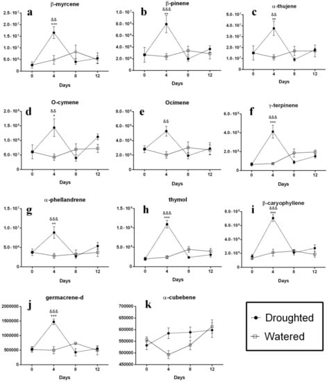 Mahdavi, A.; Moradi, P.; Mastinu, A. Variation in Terpene Profiles of Thymus vulgaris in Water Deficit Stress Response. Molecules 2020, 25, 1091. https://doi.org/10.3390/molecules25051091
