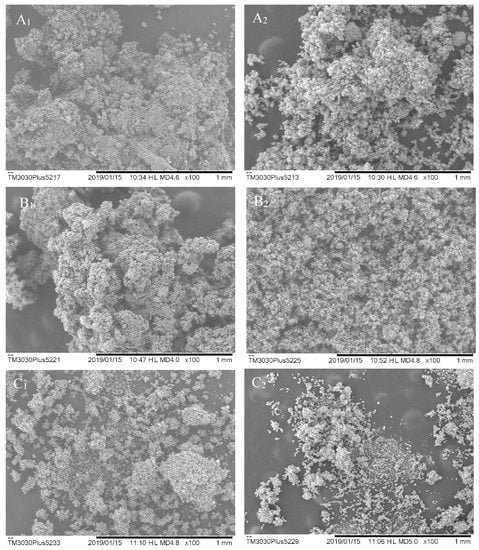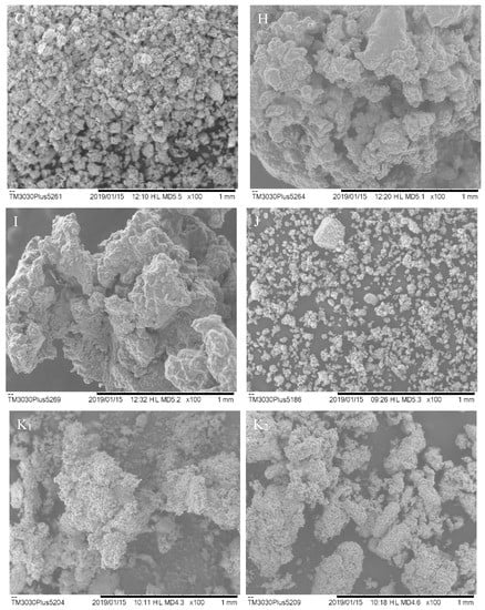 SEM images show that there is no uniformity in the particle sizes, as represented in Figure 1. They presented amorphous characteristics, some spherical surfaces, and they are prone to agglomeration. In general, the particles have wrinkled surfaces and irregular shapes, which attribute the low flowability of the powders to these morphological properties []. Particle agglomeration can be related to high particle hydration, as shown in the samples with lower Aerosil® concentration in ESB.