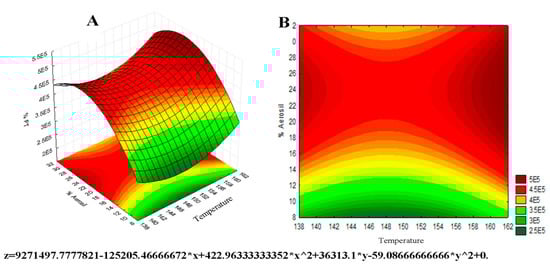 Surface response graph 32 for temperature and Aerosil® percentage factors in relation to total flavonoid content. Surface response in 3D (A) and 2D contour plot (B).
