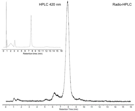 NMR spectra were recorded with an Agilent 400 MR spectrometer (Santa Clara, CA, USA) operating at 400.445 MHz (1H). For analytical HPLC, a Hitachi Chromaster (Tokyo, Japan) equipped with a Carroll and Ramsey 105-S radio-detector and a Hitachi 5430 double diode array detector with a Phenomenex Luna 3 μ C18 (2) column was applied. The UV-signal at 270 and 420 nm was recorded. The eluents used were 0.1% TFA in Milli-Q water (A) and 0.1% TFA in ACN (B). The following gradient was used with a flow rate of 0.5 mL/min: 0–0.1 min: 0% B; 0.1–1 min: 0%–45% B; 1–7 min: 45%–55% B; 7–9 min: 55%–60% B; 9–10 min: 60%–100% B, 10–12 min: 100% B; 12–14: 100%–0% B; 14–16 min: 0% B.