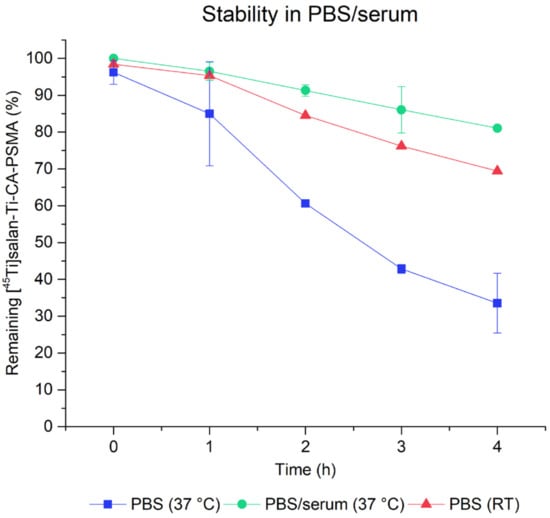 The stability of [45Ti]salan-Ti-CA-PSMA ([45Ti]-3) in PBS buffer at 37 °C (blue squares) and at room temperature (red triangles) and in PBS/mouse serum 1/1 (v/v) at 37 °C (green circles). The [45Ti]salan-Ti-CA-PSMA was quantified by radio-TLC using nonradioactive salan-Ti-CA-PSMA (3) as reference material.
