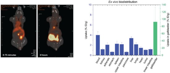 The in vivo distribution of [45Ti]salan-Ti-CA-PSMA ([45Ti]-3) in PSMA-positive tumor-bearing mice was conducted with four animals, which all received the same batch of [45Ti]salan-Ti-CA-PSMA. The radiotracer was administered at 4, 5.5, 6, and 7.5 h after end of synthesis (EOS), respectively, with a maximal radiochemical purity of 69% (4 h after EOS). The molar activity was 14–30 GBq/µmol depending on the injection time. The microPET scans (Figure 4) showed a high radioactivity accumulation in the gallbladder and intestine. However, no visible uptake of the radiotracer in the tumor, located at the left shoulder of each mouse, was observed. The ex vivo biodistribution (post-mortem) for all four mice was analyzed by measuring the injected dose per gram tissue (% ID/g) of the different organs analyzed (Figure 4). A low amount of radioactivity (1.1 ± 0.1% ID/g) was observed in the tumor tissue; however, this amount was not notably higher than that for the other organs, and it may arise from the blood content. A significant amount of radioactivity per weight of organ was found in the blood (4.0 ± 0.6% ID/g) and in the liver (3.4 ± 0.3% ID/g), while the highest accumulation per weight of organ was observed in the gallbladder (92.7 ± 40.5% ID/g). The gallbladder of the mouse no. 1 was not analyzed since the high accumulation of radioactivity in the gallbladder was noticed after the analysis of the microPET scan of this mouse. A relative large variation between the three other mice was observed for this organ. This variation was expected to be due to the low mass of the gallbladder (6–7 mg), which could cause uncertainty on the mass of the organ. The PET images and the ex vivo biodistribution of the four mice indicated that [45Ti]salan-Ti-CA-PSMA ([45Ti]-3) was metabolized and/or excreted through the hepatobiliary system.