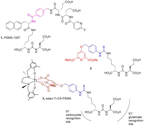 The docking studies revealed striking similarities between the mode of active site binding in (3) and in the co-crystallized (1), PSMA-1007 (Figure 1). The carbonyl group of the urea is anchored to Zn2+ (815), in both structures, while the carboxylate groups of the P1′ formed hydrogen bonds to Arg 210, Asn 257, Tyr 552, Tyr 700, and Lys 699 of the S1′glutamate recognition site of the protein. The interaction with Arg 463 locks in place the thiourea carbonyl in (3) and the corresponding amide carbonyl in (1) forcing the benzylic groups to become coplanar and occupy almost the same space in the active site. The significant difference in binding between (1) and (3) is in the positioning of the terminal residues. While the fluoropyridine ring of (1) is forced into a small pocket formed by Trp 541, Arg 511, and Arg 463, the bulky salan-Ti-CA chelate is protruding into a much larger opening shaped by Arg 511, Tyr 709, Arg 181, and Lys 545. The structure (3) also lacks the stabilizing interaction of the naphthalene residue with the hydrophobic accessory pocket of the protein, which can affect the overall binding.